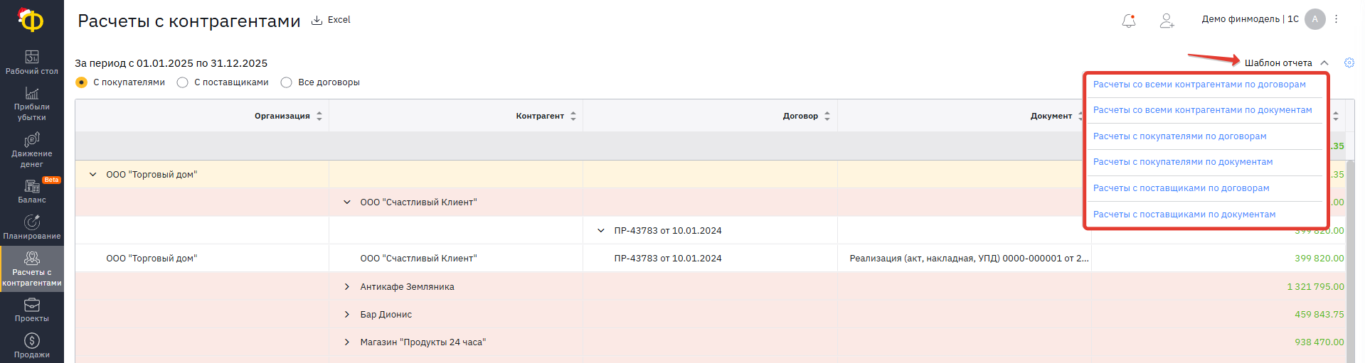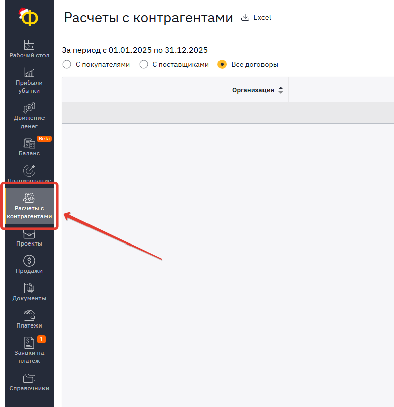 Отчет «Расчеты с контрагентами» находится в отдельной вкладке на панели слева: