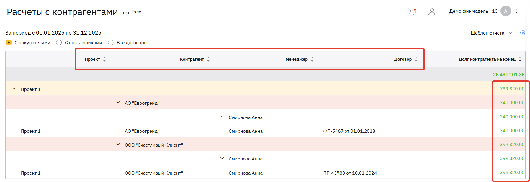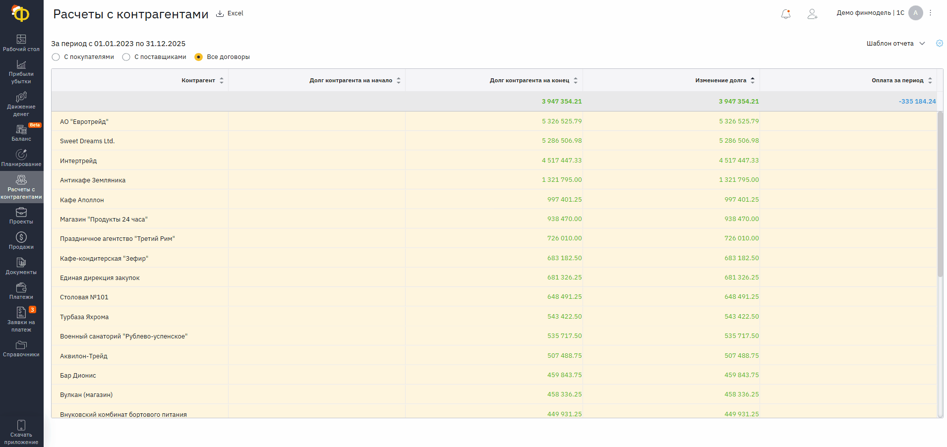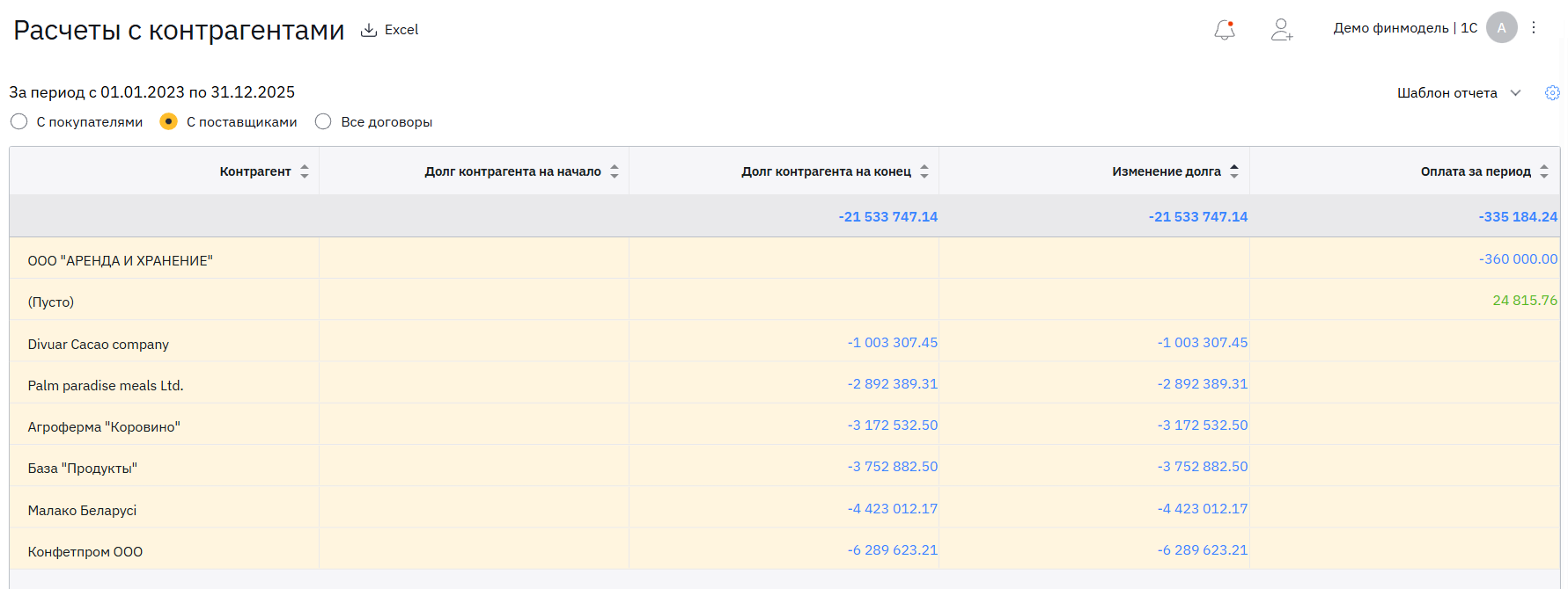 Так будет видно, какие контрагенты должны больше всего, как изменилась их задолженность за выбранный период.