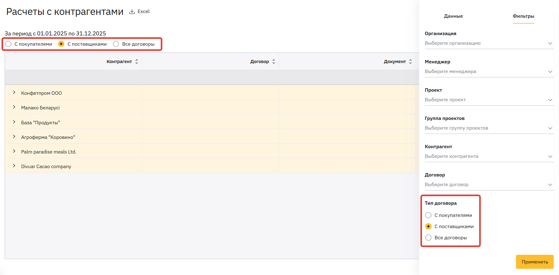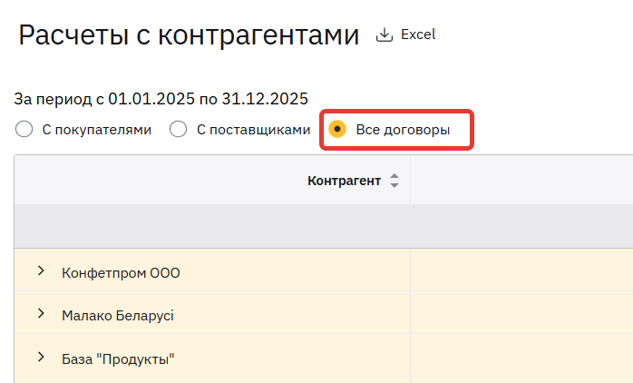 Так как один и тот же контрагент может выступать и в роли покупателя, и продавца, мы опираемся на тип договора, по которому происходят расчеты.