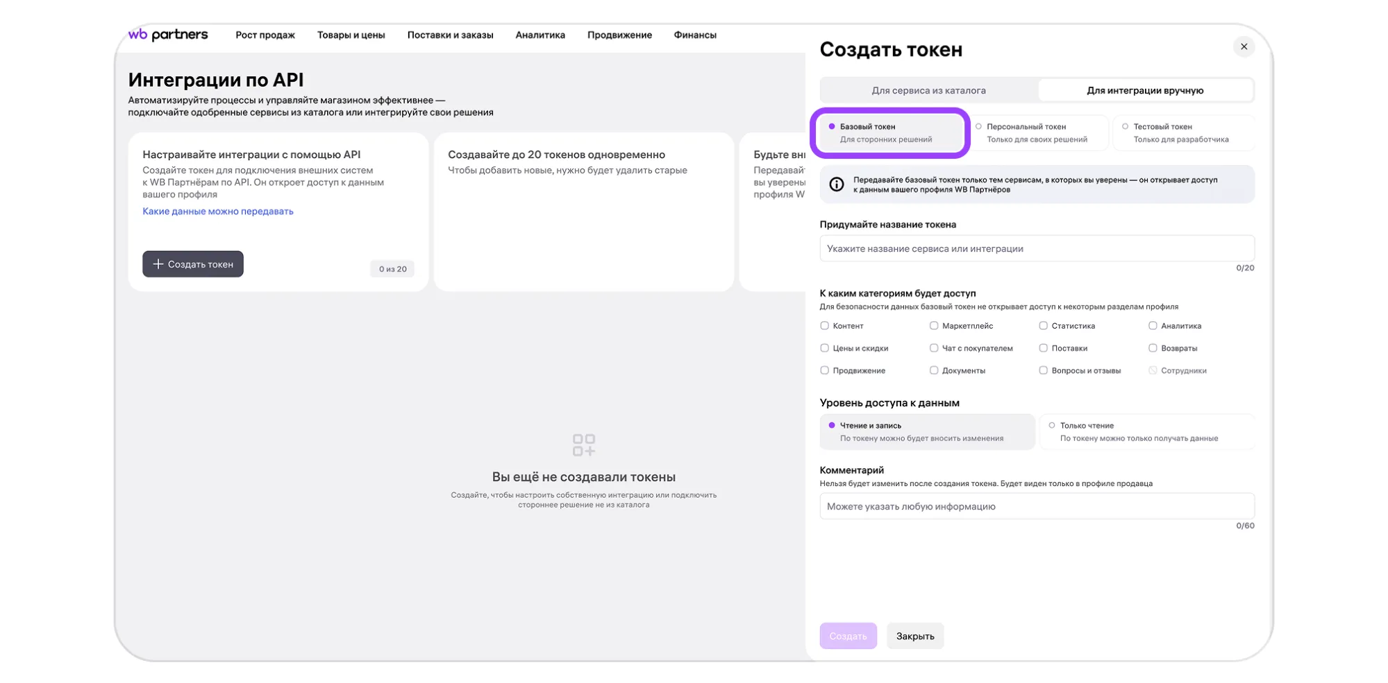 Токены API владелец личного кабинета генерирует самостоятельно в разделе «Интеграции по API».