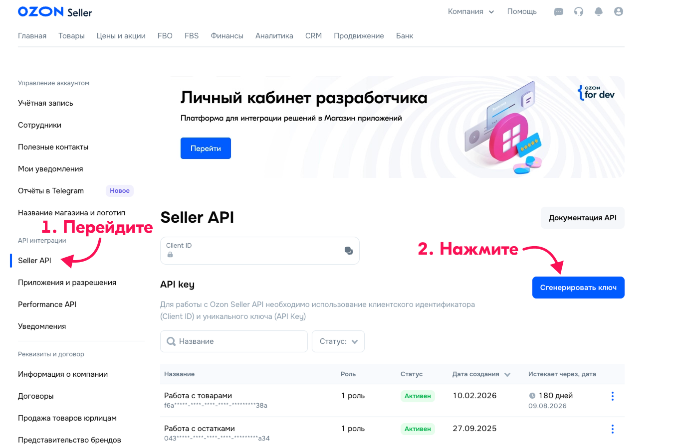 В кабинете «Ozon Seller» создайте свой уникальный API-ключ: