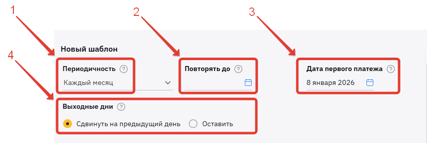 ⚠️ Обратите внимание, что если не ограничить срок повторений (2), то количество изначально созданных платежей будет зависеть от выбранной периодичности.
