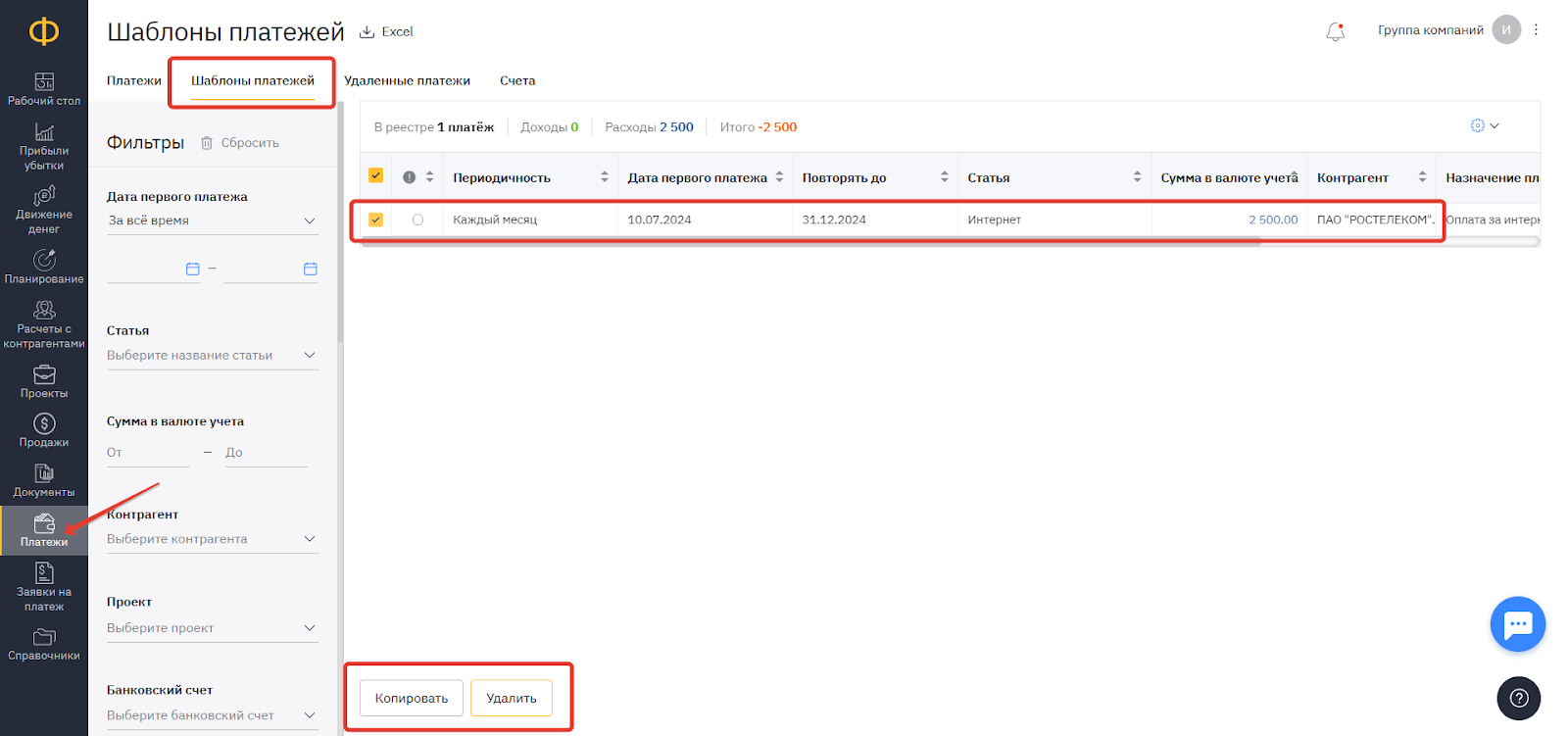 После сохранения во вкладке «Шаблоны платежей» появится новый шаблон.