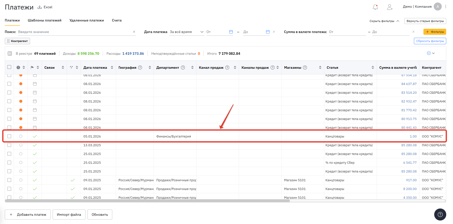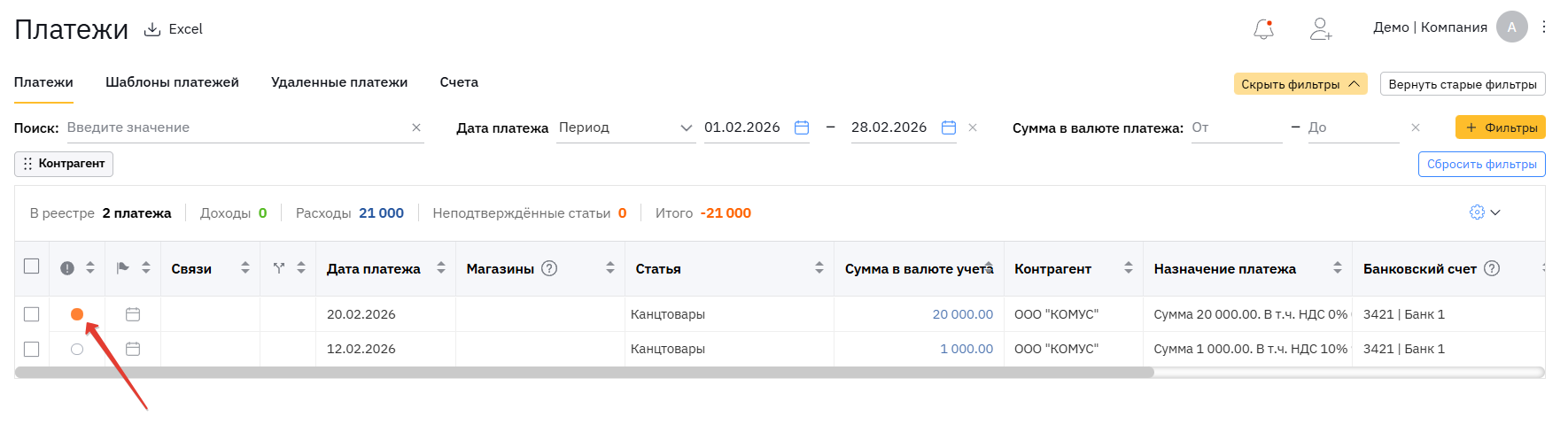 В отчёте и в реестре «Платежи» такие платежи будут отмечены цветным маркером: