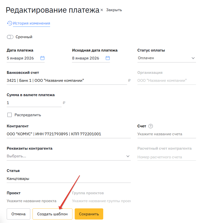 - создать шаблон на основе уже ранее оплаченного платежа.