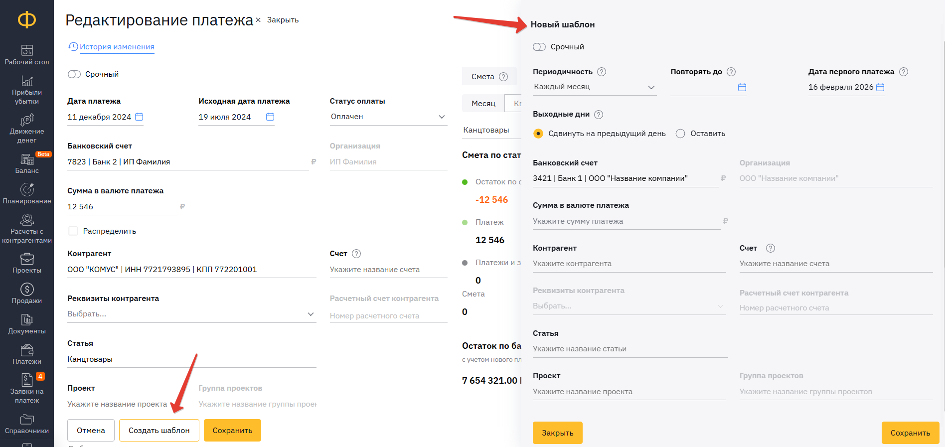 - Создание нового шаблона платежа