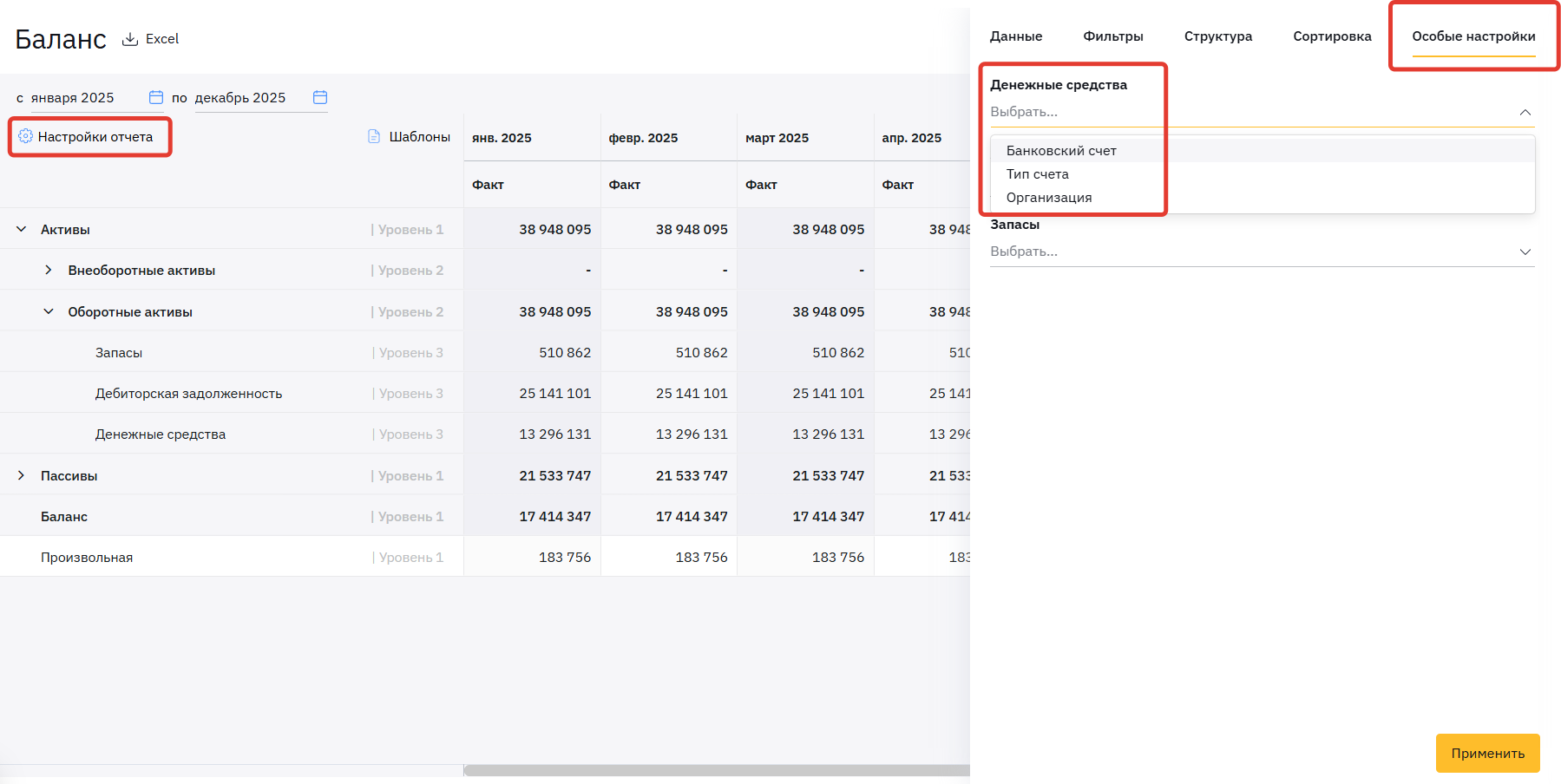 Денежные средства можно детализировать в настройках отчета по счетам, типам и организациям: