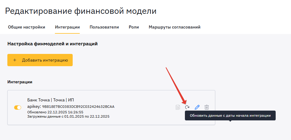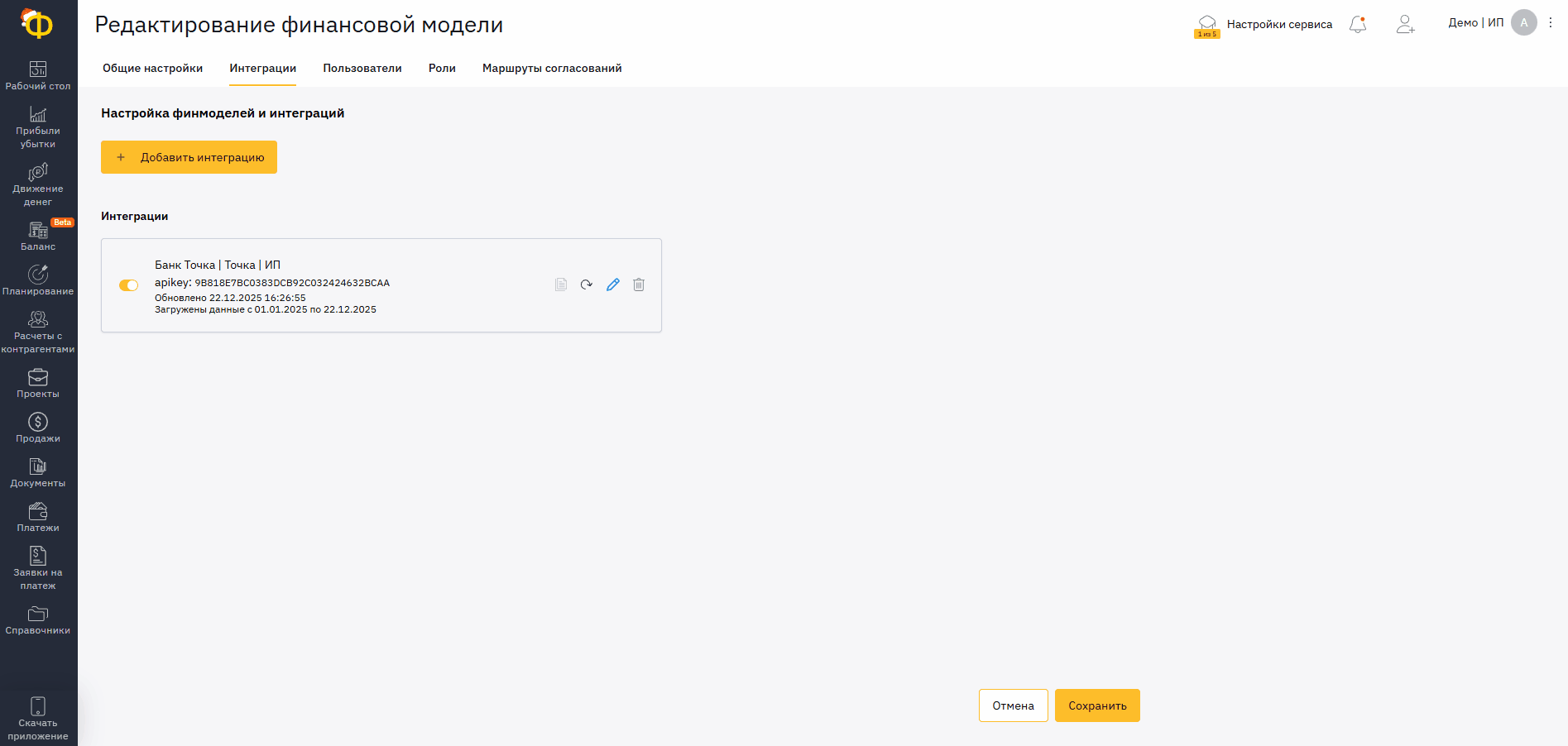 Чтобы синхронизировать данные в течение дня, перейдите в «Настройки финмодели» (1) → вкладка «Интеграции» (2) → далее в настройки интеграции (3):