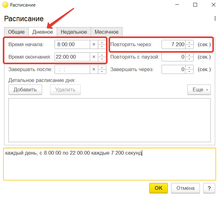 В открывшейся форме расписания выберите нужную периодичность: например, повторять 1 раз в день с 8:00 до 22:00, каждые 7200 секунд и нажмите «ок»: