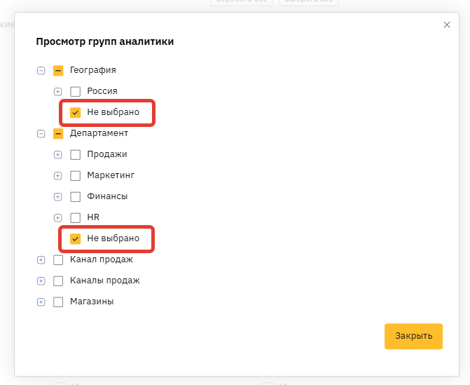 ❗️ Если в Вашей финансовой модели проекты и группы аналитик не используются, нужно включить «Остальные» в проектах и «Не выбрано» в группах аналитик.