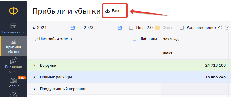 💡Если есть действие «Экспорт», то рядом с названием раздела будет доступна кнопка «Excel»: