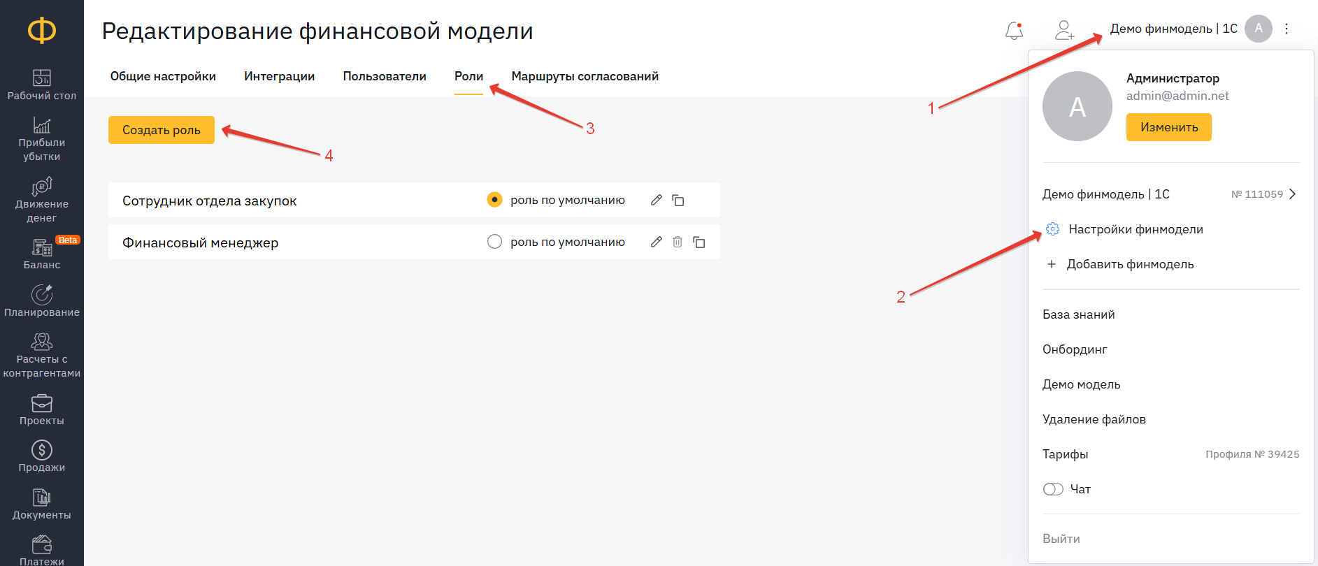 🔸 Роли для индивидуальной настройки доступа – создаются внутри каждой финмодели Администратором или Администратором финмодели самостоятельно.