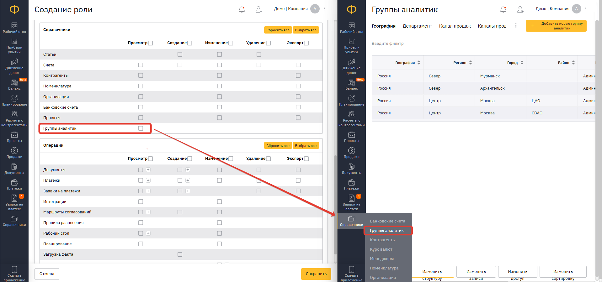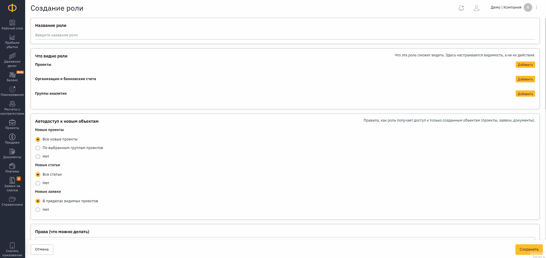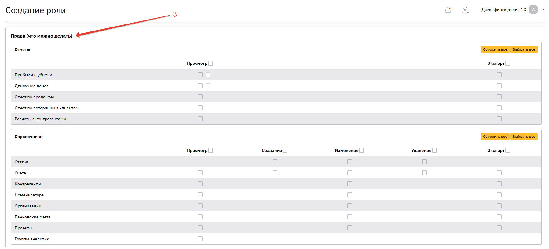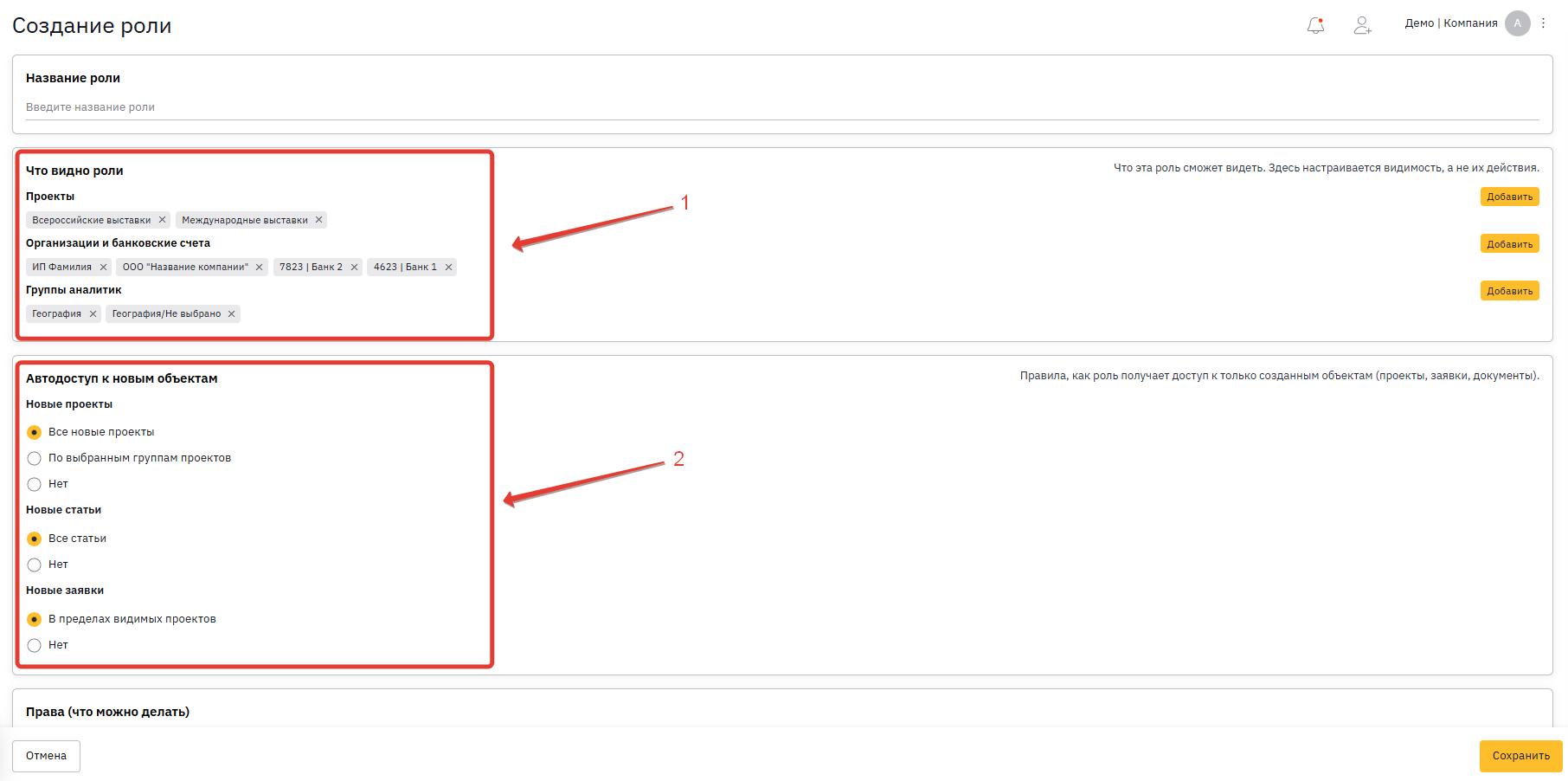 (1) Что видно роли – это какая информация будет видна пользователю (Организации и банковские счета, Проекты, Группы аналитик).