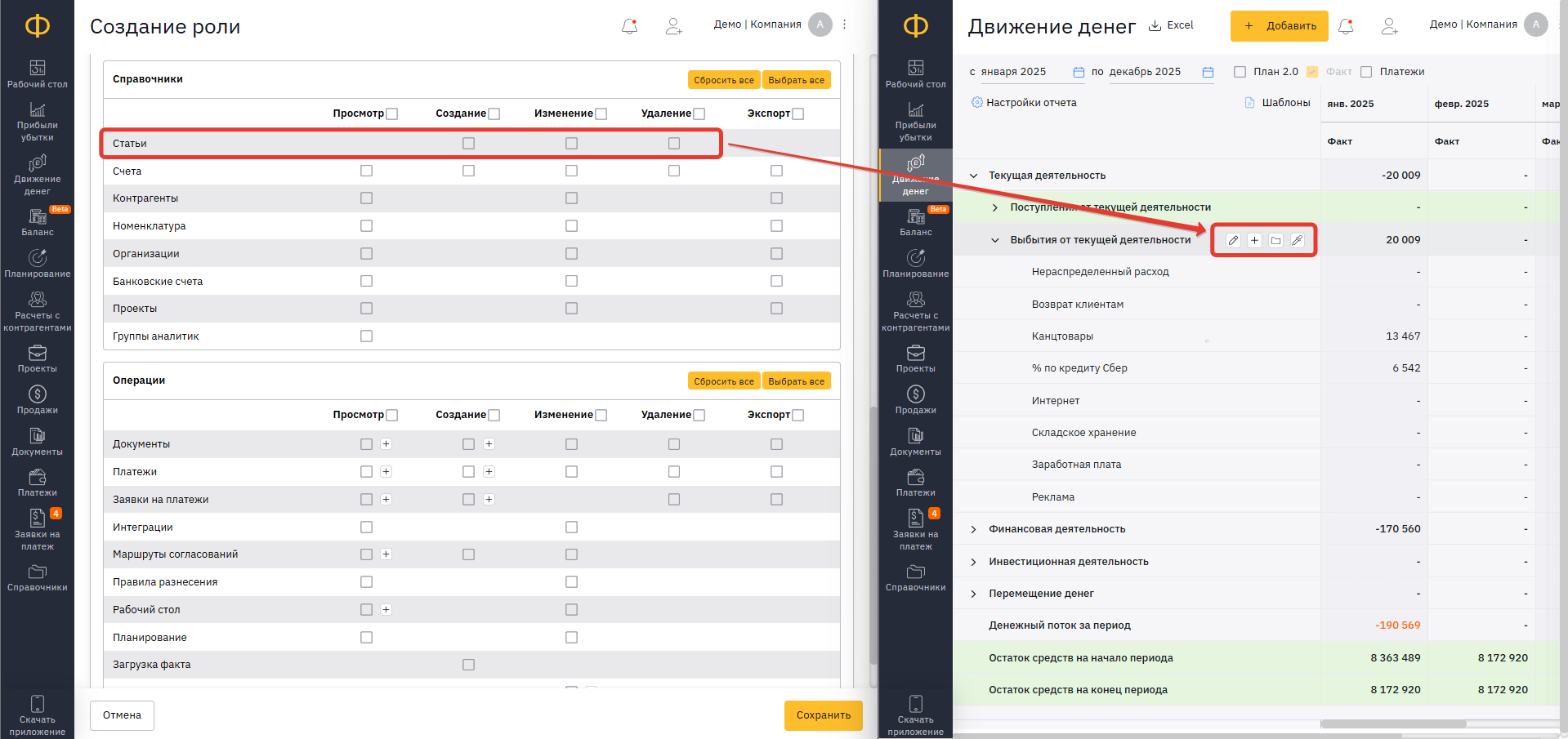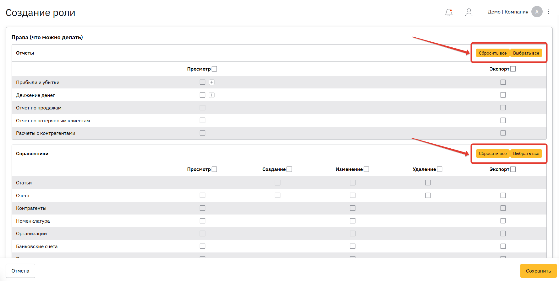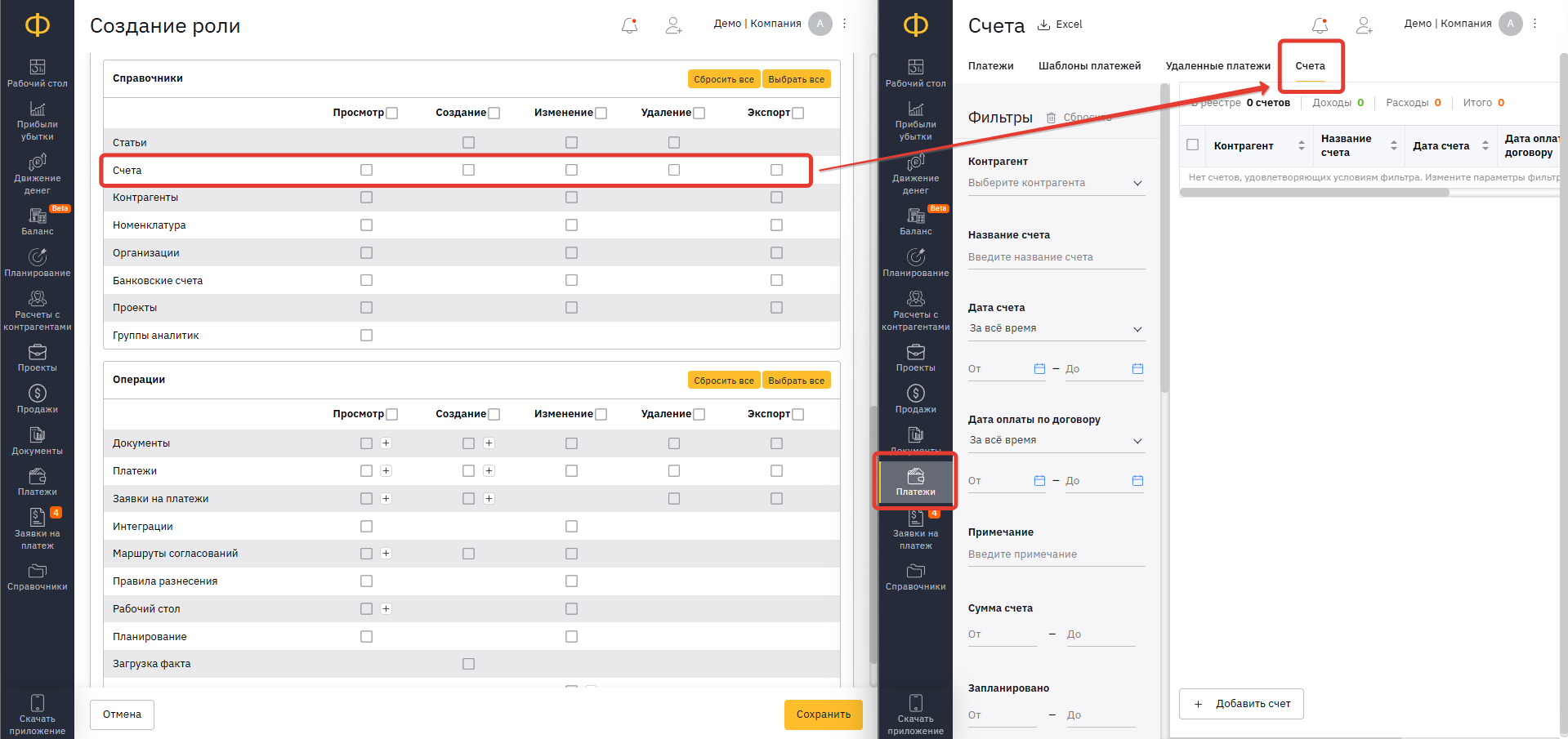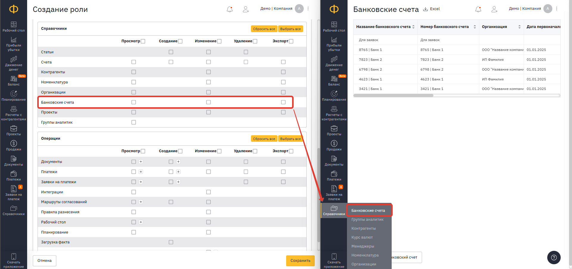 (1) Что видно роли – это какая информация будет видна пользователю (Организации и банковские счета, Проекты, Группы аналитик).