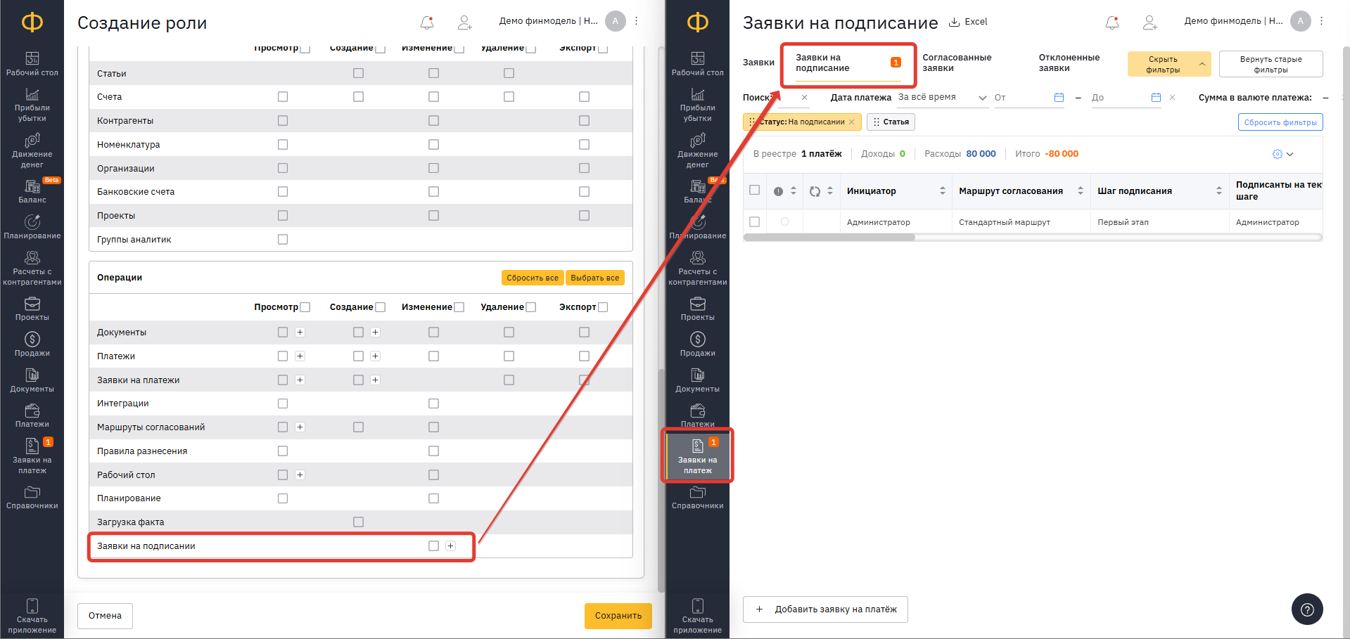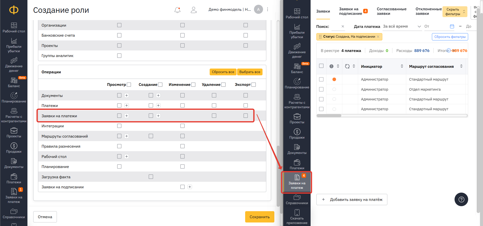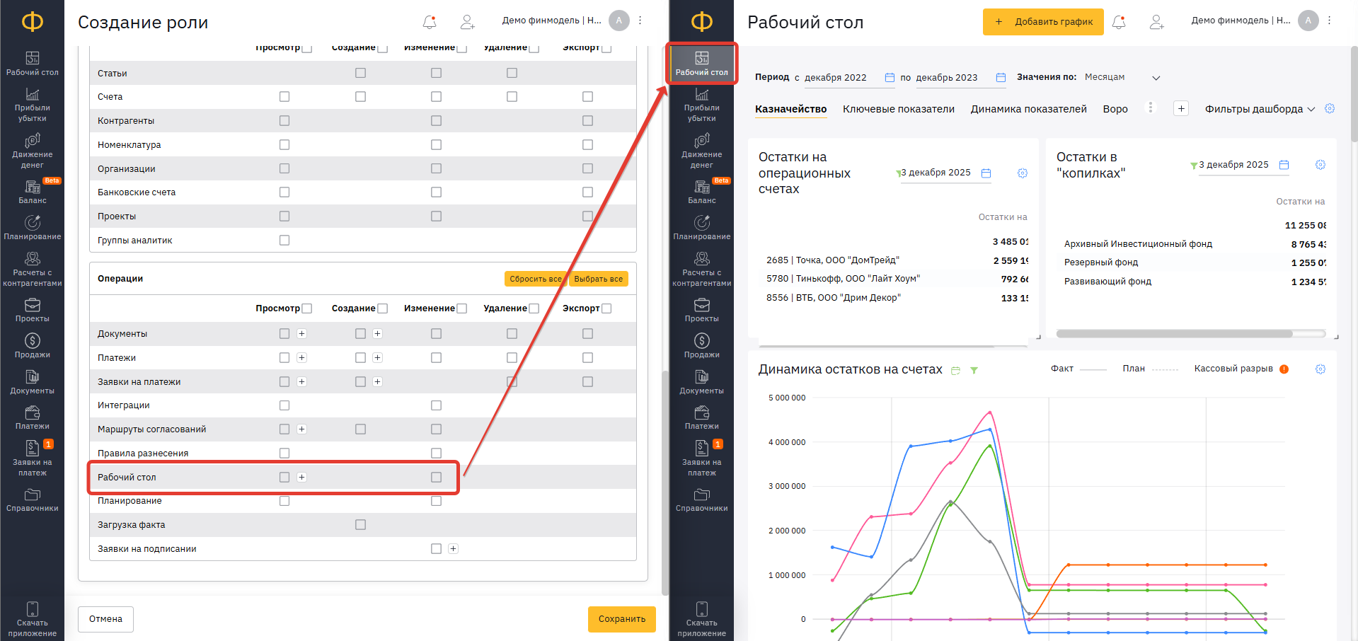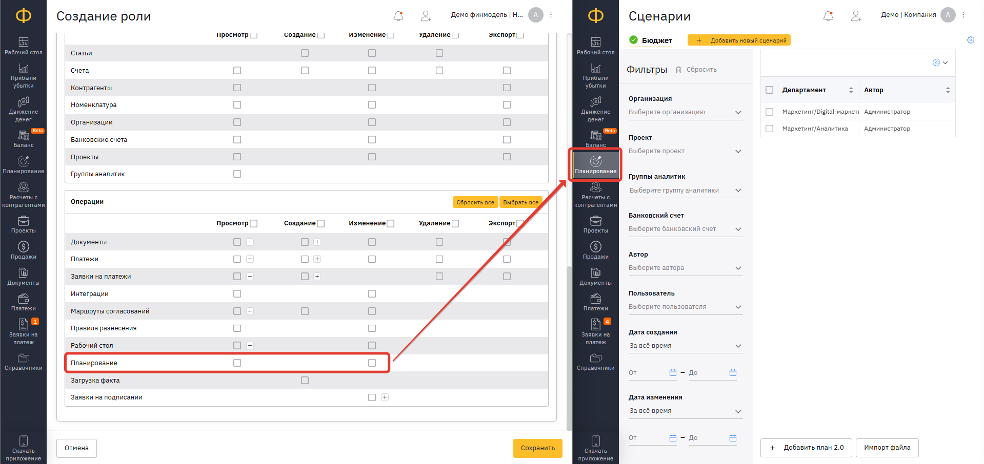 (1) Что видно роли – это какая информация будет видна пользователю (Организации и банковские счета, Проекты, Группы аналитик).