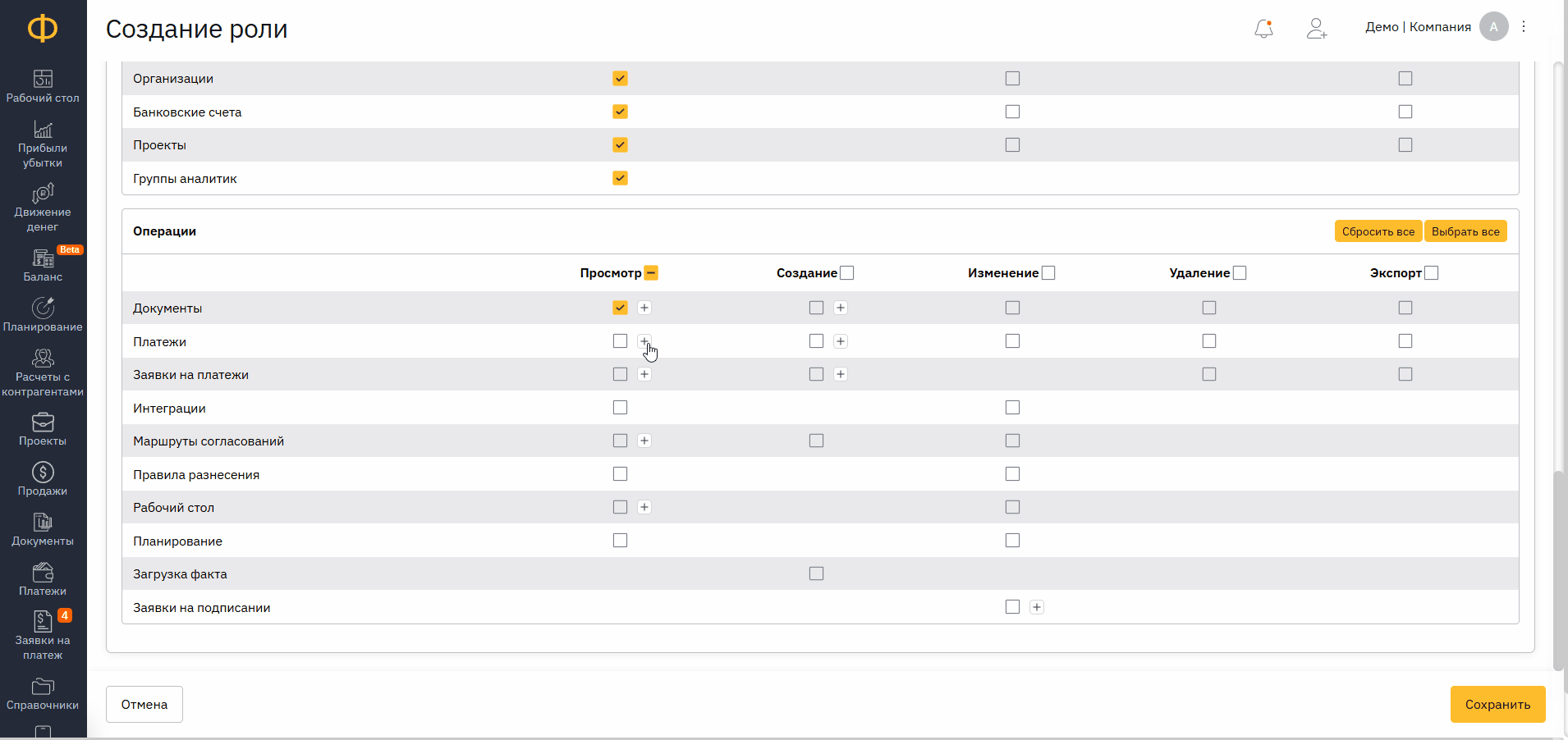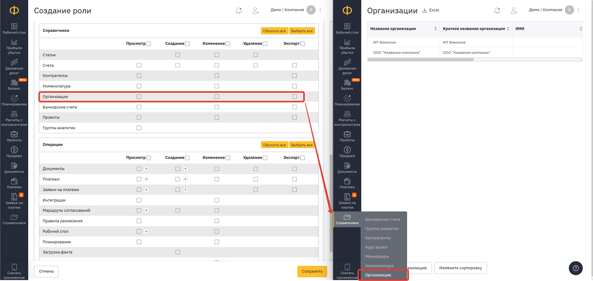 💡 Если данный раздел отключен, то в документе, платеже, заявке или отчетах пользователь сможет выбрать те организации, к которым имеет доступ в разделе «Что видно роли».