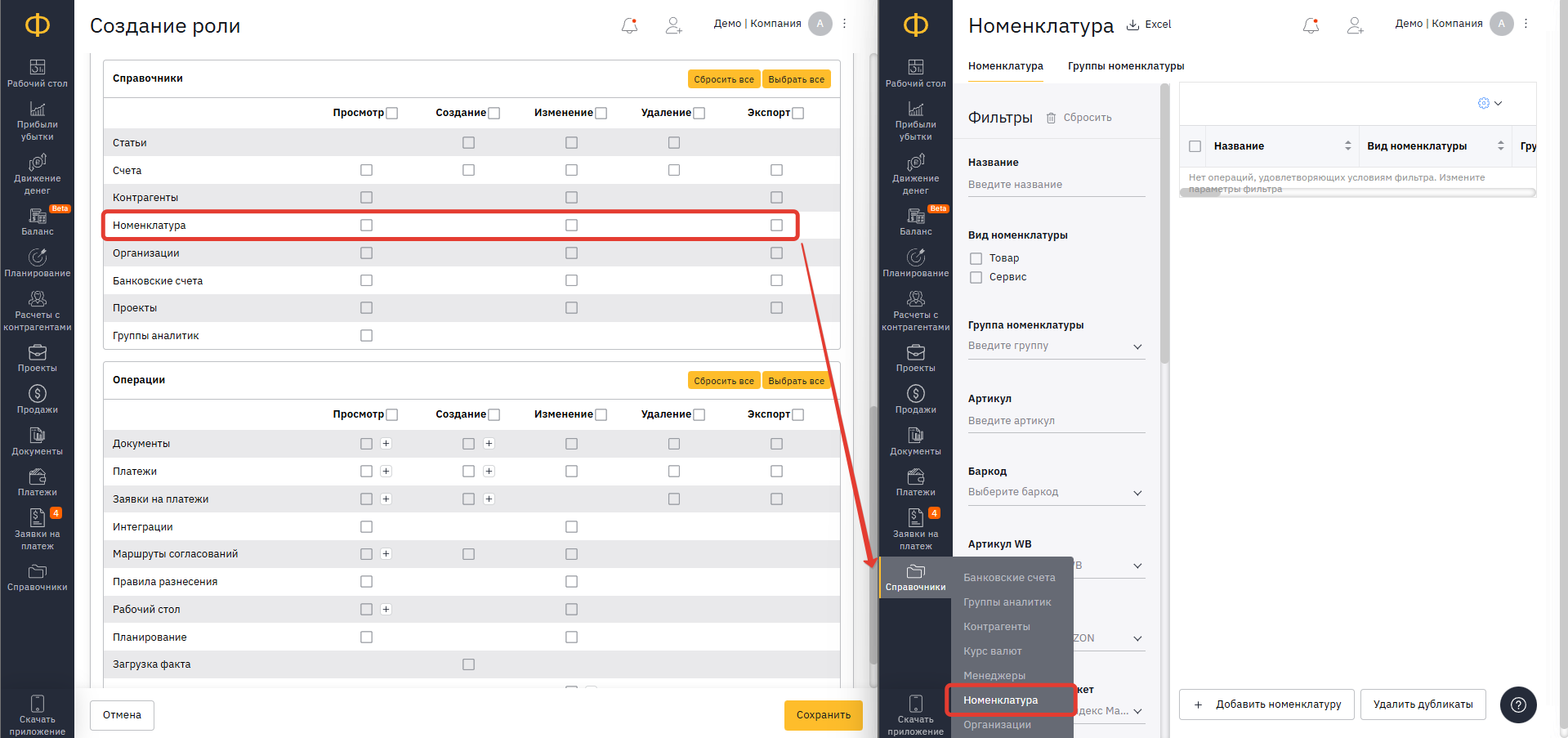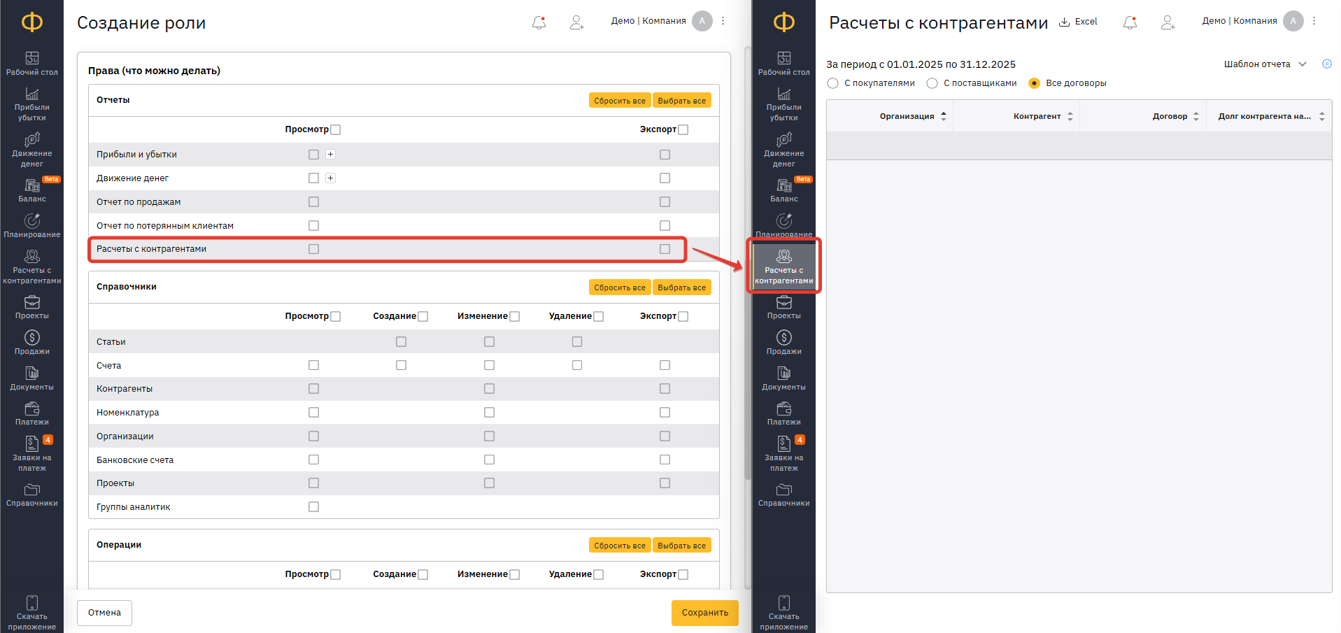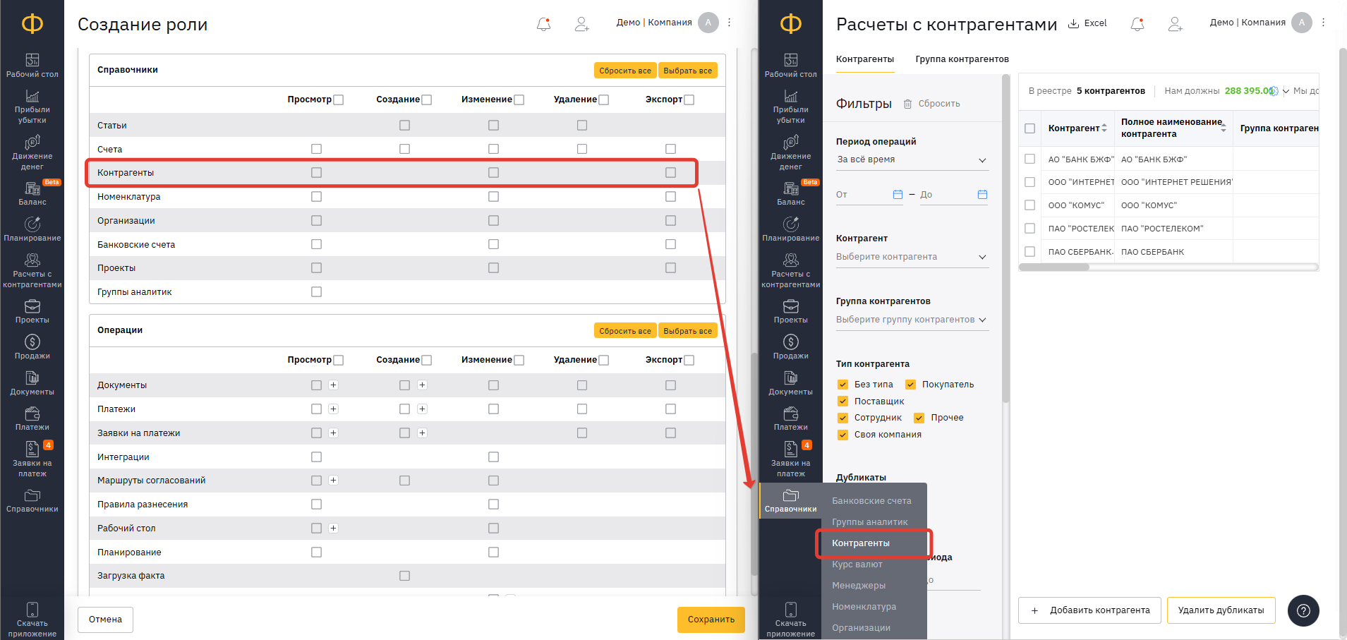 💡 Если данный раздел в «Роли» отключен, то выбрать контрагента в документе, платеже или заявке пользователь всё равно сможет.