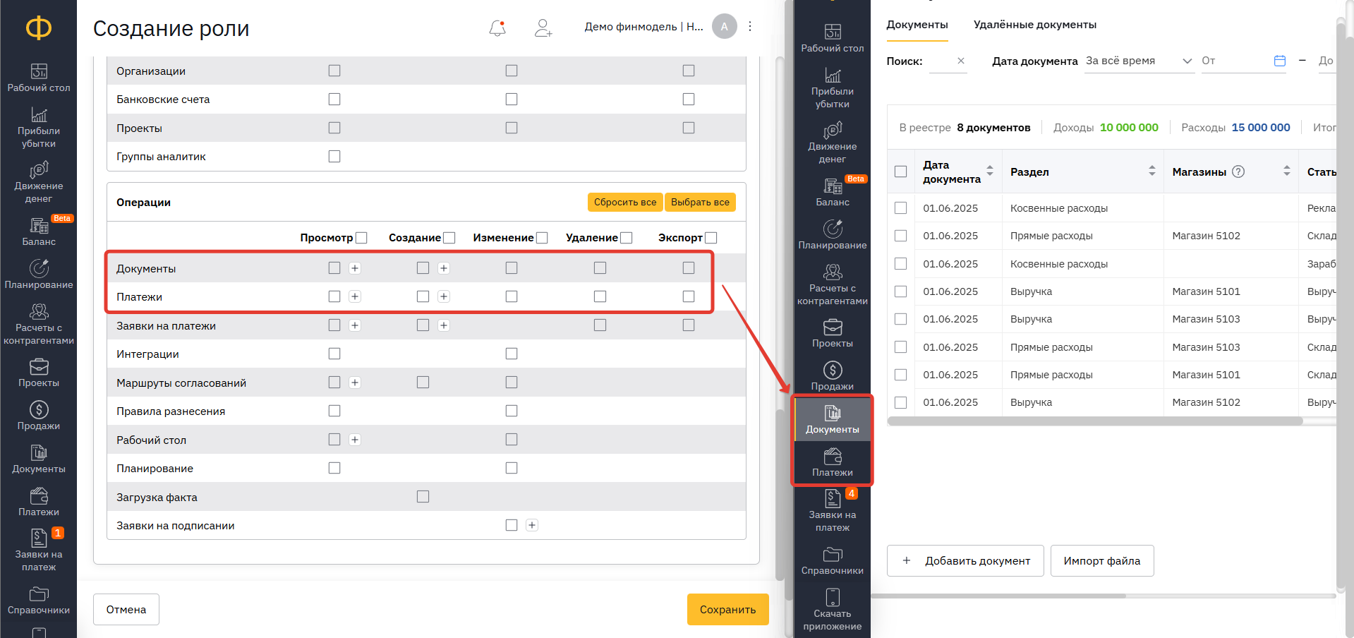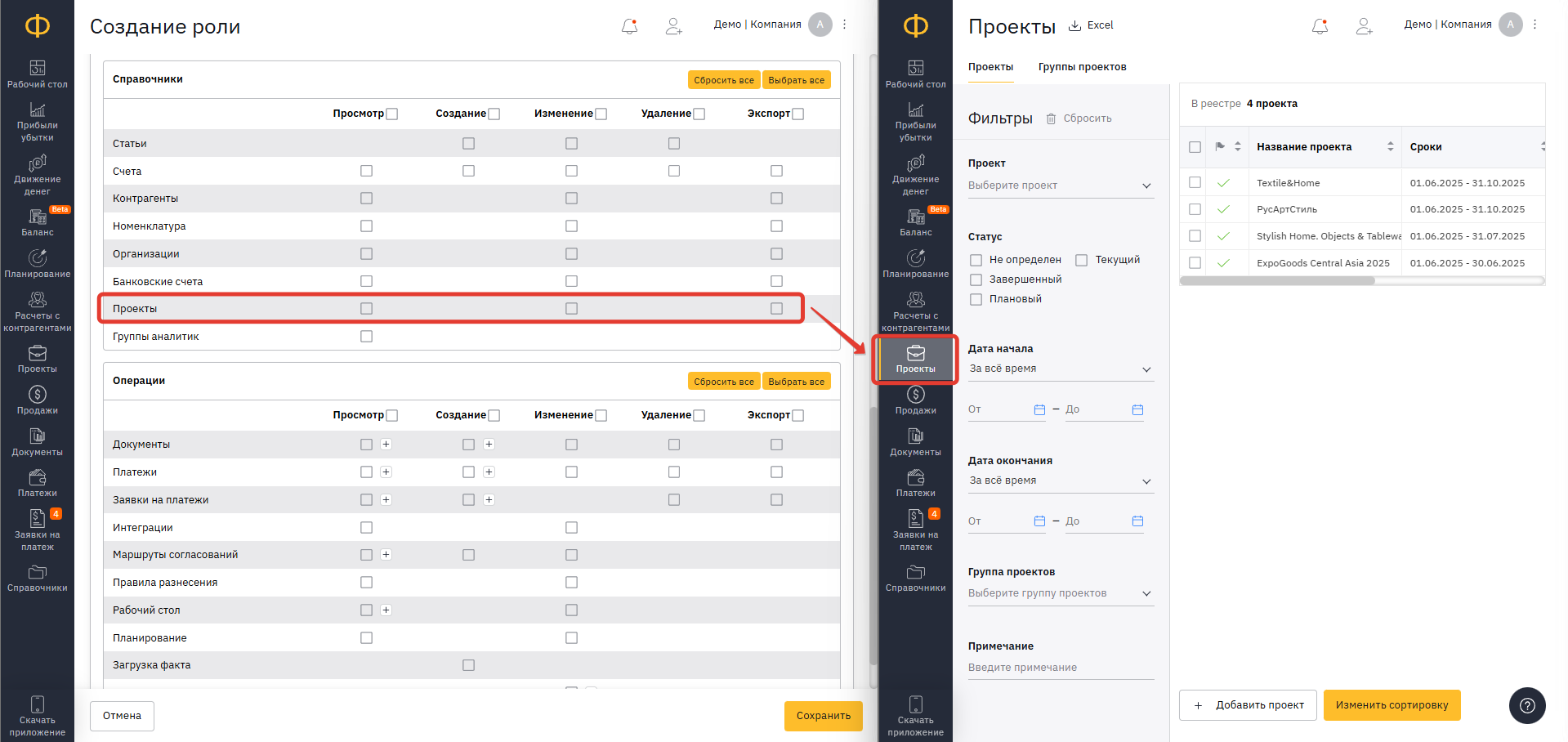 💡 Если данный раздел отключен, то в документе, платеже, заявке или отчетах пользователь сможет выбрать те проекты, к которым имеет доступ в разделе настроек «Что видно роли».