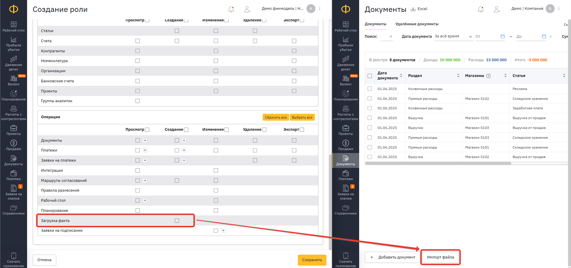 Это доступ к функционалу «Импорт файла» в разделе «Документы» и «Платежи», а также возможность добавления данных в произвольные показатели.