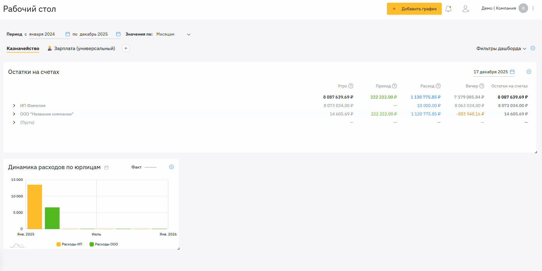 в разрезе банковских счетов, организаций или валюты.